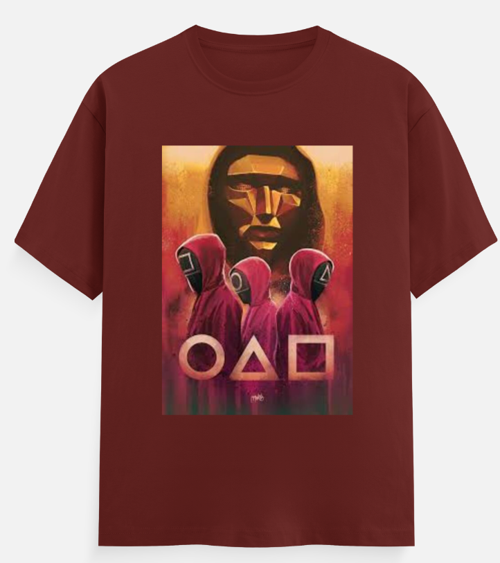 This bold maroon t-shirt features a striking graphic inspired by the hit series Squid Game. The design showcases the enigmatic Front Man in a stylized, golden mask looming in the background, with three guards clad in signature red jumpsuits and masks marked with a circle, triangle, and square. These shapes represent the strict hierarchy within the game. The fiery background enhances the tension and drama of the scene, making this shirt a must-have for fans who appreciate the show's intense themes and visual symbolism.